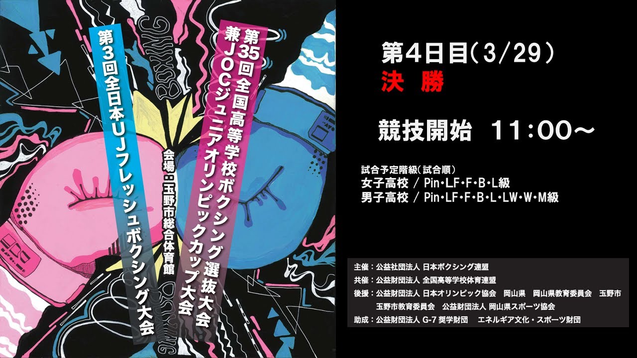Please check the URL below for match combinations, etc. https://jabf-revival.com/jabf_tournament/2024junior-olympic-cup-tournament/ Tournament name: 35th National High School Boxing Selection Tournament and JOC Junior Olympic Cup Boxing Tournament Period: March 25, 2024 ~29th㈮ Start date and time: Competition starts from 11:00~ Competition venue: Tamano City General Gymnasium (Okayama Prefecture)