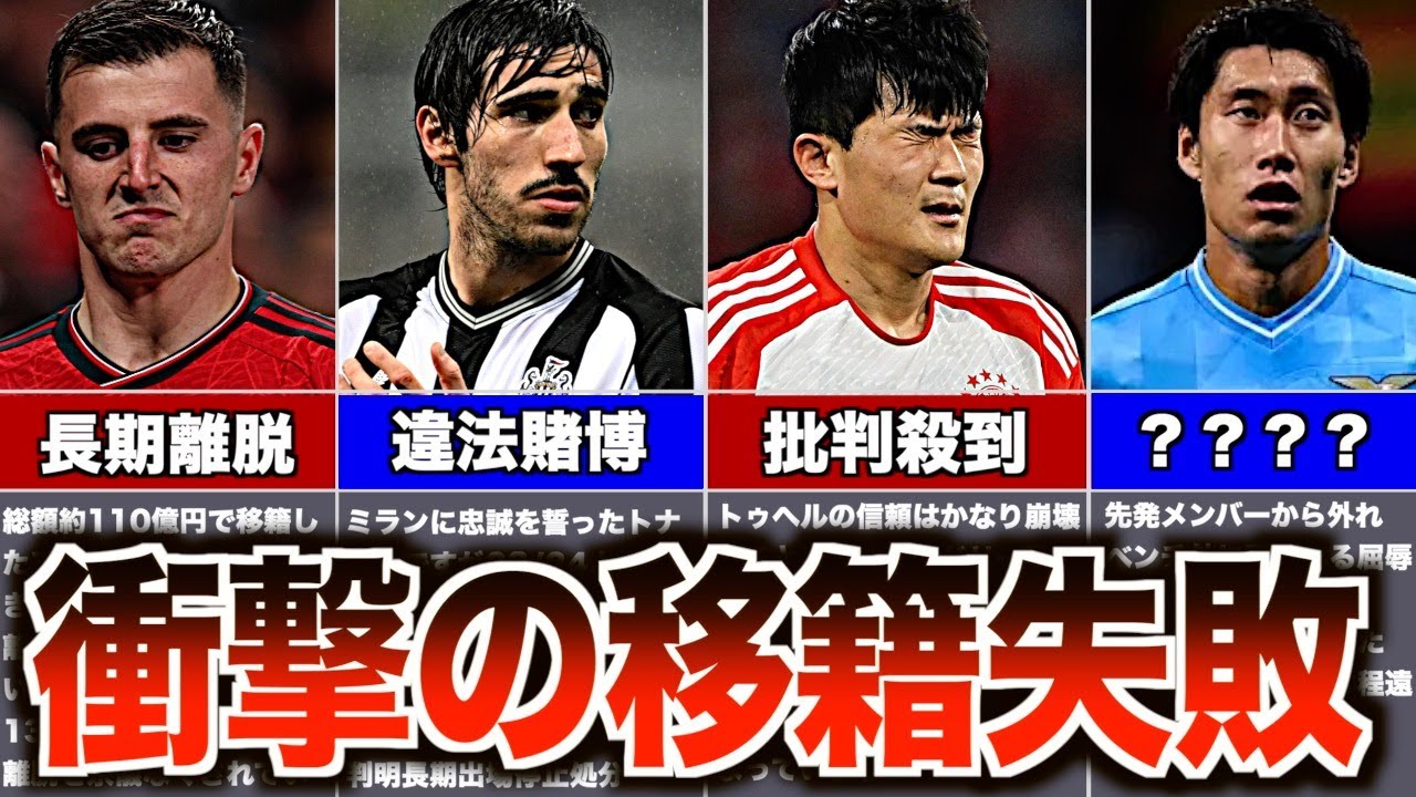 Every year, many players transfer to make their dreams come true, but this time we would like to introduce 10 players who made a step-up transfer but were branded as “transfer failures.” There are a lot of big names lined up, so if you are interested, let’s think about it together. *At the beginning, we introduced 9 people, but there are 10! I must sincerely apologize. *This video was created as of May 15th. Although we try to update the information as much as possible until the last minute, there is a possibility that the information may have been slightly updated by the time it is published. note that. Thank you for always watching. Everyone’s comments are very encouraging! If there are any clubs or players you’d like to see featured, we’d love to hear your requests in the comments section! https://www.transfermarkt.jp/ Transfermarkt is used as a reference for results and ranking trends *A seems to include PK acquisition, so there may be some discrepancies with other results, but it is highly comprehensive. We are hiring a directory administrator👉Masoo #Premier League #Bundesliga #Serie A ↓Click here to subscribe to the channel↓[Crack Football]https://www.youtube.com/channel/UCluQJWgkxYmkozxiRDwiRmQ?sub_confirmation=1[Crack JAPAN ]https://www.youtube.com/channel/UCbQe_MUwYBEFwSMGMYHR4Nw[I’m also on Twitter]https://twitter.com/@Crackfootball1 ——————————————————— ———— 00:34 Mason Mount 3:15 Christopher Nkunku 5:14 Romeo Lavia 6:55 Sandro Tonali 7:58 Vitor Rocchi 10:20 Kim Min-Jae 11:58 Samuel Chukwueze 13:27 Jesper・Lindstrom 14:54 Daichi Kamata 16:57 Kiyo Ueda Music by) ・Jim Yosef & Anna Yvette – Linked [NCS Release]