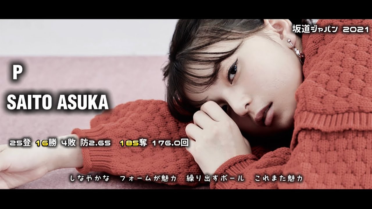 2021 Sakamichi JAPAN Japan National Team Members[Tournament Results Version]8 Tamura 9th Attack .270 (37-10) 0 Home Run 3 RBI 2 Stolen .710 (Kanejo/Yokohama) 6 Yoda 9th Attack .405 (37-15) 1 Home Run 5 RBI 1 Stolen .988 (Yamada/Yakult) 5 Yamashita 9th Attack .277 (36-10) 0 Home Run 4 RBI 0 Stolen .677 (Takahashi/Giants) 7 Kato 9th Attack .343 (32-11) 1 Home Run 6 RBI 0 Stolen .990 (Yoshida/Orix) D Ikuta 8th Attack .258 (31-8) 2 Home Run 5 RBI 0 Stolen .725 (Fukudome/Chunichi) 4 Nibu 9th Attack .352 (34-12) 1 Home Run 3 RBI 1 Stolen.893 (Nishino/Orix) 3 Kumi 7 attempts .384 (26-10) 1 home run, 4 RBIs, 0 stolen balls .955 (Oyama/Hanshin) 2 Akimoto 8 attempts .250 (32-8) 0 home runs, 2 RBIs, 0 stolen balls .624 (Shima/Rakuten) 9 Kaki 7 attempts .444 (27-12) 0 home runs, 3 RBIs, 2 stolen balls .922 (Aizawa/Hiroshima) 1 Asuka 2 pitches 2 wins, 0 losses, ERA 0.00 19 strikeouts, 14.0 innings (Suginai/Softbank) P Morita 2 pitches 2 wins, 0 losses, ERA 2.95 15 strikeouts, 12.2 innings P Saito 2 pitches 1 win, 0 losses, ERA 2.23 15 strikeouts, 12.1 innings[Seasonal performance version]8 Tamura 124 attempts .293 32 home runs 98 RBIs, 22 stolen bases, .924 6 Yoda, 143 attempts, .300 27 home runs, 90 RBIs, 12 stolen bases, .908 5 Yamashita, 143 attempts, .302 25 home runs, 102 RBIs, 3 stolen bases, .900 7 Kato, 143 attempts, .321 42 home runs, 100 RBIs, 2 stolen bases, 1.051 D Ikuta, 140 attempts, .305 28 home runs, 101 RBIs, 0 stolen bases, .932 4 Nibu, 141 attempts, .270 30 home runs, 93 RBIs, 8 stolen bases, .891 3 Kumi, 142 attempts, .276 23 home runs, 82 RBIs, 0 stolen bases, .826 2 Akimoto, 140 attempts, .308 16 home runs, 76 RBIs, 0 stolen bases, .869 9 Kaki, 143 attempts, .2819 homers, 50 RBIs, 21 steals, .752 1 Asuka, 25 hits, 16 wins, 4 losses, ERA 2.65, 185 strikeouts, 176.0 innings[Pitchers](10 players) 11 Saito Kyoko/Hinatazaka46 24 hits, 13 wins, 3 losses, ERA 2.65, 168 strikeouts, 159.2 innings, 2 hits (2nd inning) 1 win, 0 loss, ERA 2.23, 15 strikeouts, 12.1 innings 13 Watanabe Risa/Sakurazaka46 23 hits, 10 wins, 6 losses, ERA 2.86, 147 strikeouts, 145.2 innings, 6 hits, 0 wins, 0 losses, 4 saves, ERA 0.00, 5 strikeouts, 6.0 innings 15 Kobayashi Yui/Sakurazaka46 25 hits, 11 wins, 8 losses, ERA 2.77, 176 strikeouts, 177.1 innings, 3 hits, 0 wins 0 losses, 2H, ERA 0.00, 6 strikeouts, 5.2 innings 16 Kawata Hina/Hinatazaka46/Additional call-up 35 pitches 4 wins, 1 loss, 11H, ERA 2.65, 168 strikeouts, 52.0 innings, 2 pitches 0 wins, 0 losses, 2H, ERA 0.00, 2 strikeouts, 1.1 innings 17 Endo Sakura/Nogizaka46 24 pitches 12 wins, 6 losses, ERA 3.27, 131 strikeouts, 150.2 innings, 2 pitches (2nd game) 1 win, 0 losses, ERA 2.45, 10 strikeouts, 11.0 innings 18 Saito Asuka/Nogizaka46 25 pitches 16 wins, 4 losses, ERA 2.65, 185 strikeouts, 176.0 innings, 2 pitches (2nd game) 2 wins, 0 losses, ERA 0.00, 19 strikeouts, 14.0 innings 19Kubo Shiori / Nogizaka46 24 pitches, 13 wins, 7 losses, ERA 3.36, 152 strikeouts, 1 pitch in 163.1 innings (first game), 1 win, 0 losses, ERA 3.60, 4 strikeouts, 5.0 innings 21 Morita Hikaru / Sakurazaka46 25 pitches, 15 wins, 5 losses, ERA 2.24, 175 strikeouts, 185.0 innings 2 pitches (second game), 2 wins, 0 losses, ERA 2.95, 15 strikeouts, 12.2 innings 22 Kageyama Yuka / Hinatazaka46 22 pitches, 9 wins, 6 losses, ERA 2.67, 103 strikeouts, 117.0 innings 3 pitches, 1 win, 0 losses, ERA 1.50, 3 strikeouts, 6.0 innings 39 Kanemura Miku / Hinatazaka46 24 pitches, 10 wins, 5 losses, ERA 3.00, 149 strikeouts 149.0 innings, 2 batters, 1 win, 0 loss, 1 H, 0.00 ERA, 5 strikeouts, 7.0 innings[Catcher](3 players) 2 Akimoto Manatsu/Nogizaka46/Captain 140 games .308 (474-146) 16 homers, 76 RBIs, 0 stolen balls .869 8 games .250 (32-8) 0 homers, 2 RBIs, 0 stolen balls .624 20 Sugai Yuuka/Sakurazaka46 127 games .284 (447-127) 20 homers, 78 RBIs, 4 stolen balls .817 4 games .300 (10-3) 0 homers, 1 RBI, 0 stolen balls .800 31 Sasaki Kumi/Hinatazaka46 142 games .276 (507-140) 23 homers, 82 RBIs, 0 stolen balls .826 7th game .384 (26-10) 1 home run, 4 RBIs, 0 stolen balls .955[Infielders](5 players) 3 Erika Ikuta/Nogizaka46 140 games .305 (498-152) 28 home runs, 101 RBIs, 0 stolen balls .932 8th game .258 (31-8) 2 home runs, 5 RBIs, 0 stolen balls .725 5 Mizuki Yamashita/Nogizaka46 143 games .302 (505-153) 25 home runs, 102 RBIs, 3 stolen balls .900 9th game .277 (36-10) 0 home runs, 4 RBIs, 0 stolen balls .677 6 Yuki Yoda/Nogizaka46 143 games .300 (500-150) 27 home runs, 90 RBIs, 12 stolen balls .9089 games .405 (37-15) 1 home run, 5 RBIs, 1 stolen ball .988 25 Watanabe Miho/Hinatazaka46/Additional call-up 137 games .274 (477-131) 26 home runs, 89 RBIs, 3 stolen balls .854 5 games .250 (4-1) 0 home runs, 1 RBIs, 0 stolen balls .666 31 Nibu Akari/Hinatazaka46 141 games .270 (480-130) 30 home runs, 93 RBIs, 8 stolen balls .891 9 games .352 (34-12) 1 home run, 3 RBIs, 1 stolen ball .893[Outfielders](4 players) 7 Kato Shiho/Hinatazaka46 143 games .321 (461-148) 42 home runs, 100 RBIs, 2 stolen balls1.051 9 games .343 (32-11) 1 home run, 6 RBI, 0 stolen balls .990 8 Haruka Kaki/Nogizaka46 143 games .281 (603-170) 9 home runs, 50 RBI, 21 stolen balls .752 7 games .444 (27-12) 0 home runs, 3 RBI, 2 stolen balls .922 10 Ten Yamazaki/Sakurazaka46 143 games .270 (524-142) 10 home runs, 57 RBI, 35 stolen balls .750 6 games .125 (8-1) 0 home runs, 0 RBI, 4 stolen balls .455 55 Hono Tamura/Sakurazaka46 124 games .293 (436-128) 32 home runs, 98 RBI, 22 stolen balls .924 9 games .270 (10-37) 0 homers, 3 RBIs, 2 steals .710 (pitcher) 30 Mirei Sasaki/Hinatazaka46/withdrew 8 hits 3 wins 2 losses ERA 4.07 47 strikeouts 45.2 innings (infielder) 1 Nao Kosaka/Hinatazaka46/withdrew 97 games .297 (103-346) 24 homers 68 RBIs 14 steals .921 *22 players can be selected, including pitchers and fielders*The top row shows the final results for 2021, and the bottom row shows the results from the Olympic Games*Due to the international tournament in the middle of the season, it is not possible to use two-way players#N