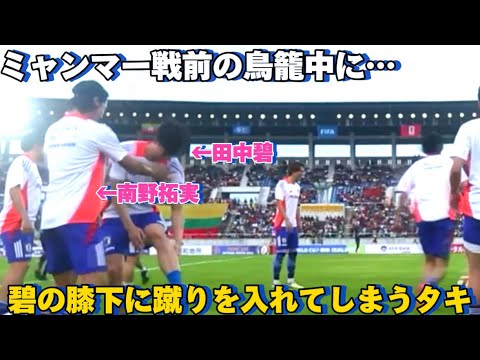 Before the match against Myanmar, Takumi Minamino accidentally kicked the ball under the knee of Aoi Tanaka, who was defending, and was left grinning by himself afterwards!