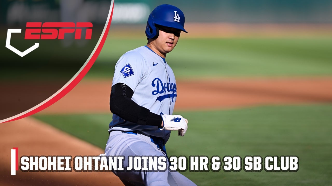 Watch as Shohei Ohtani records three stolen bases in as the Los Angeles Dodgers take on the Oakland Athletics, including his 30th stolen base of the season, making him the first primary DH in history with 30 home runs and 30 stolen bases in a season.