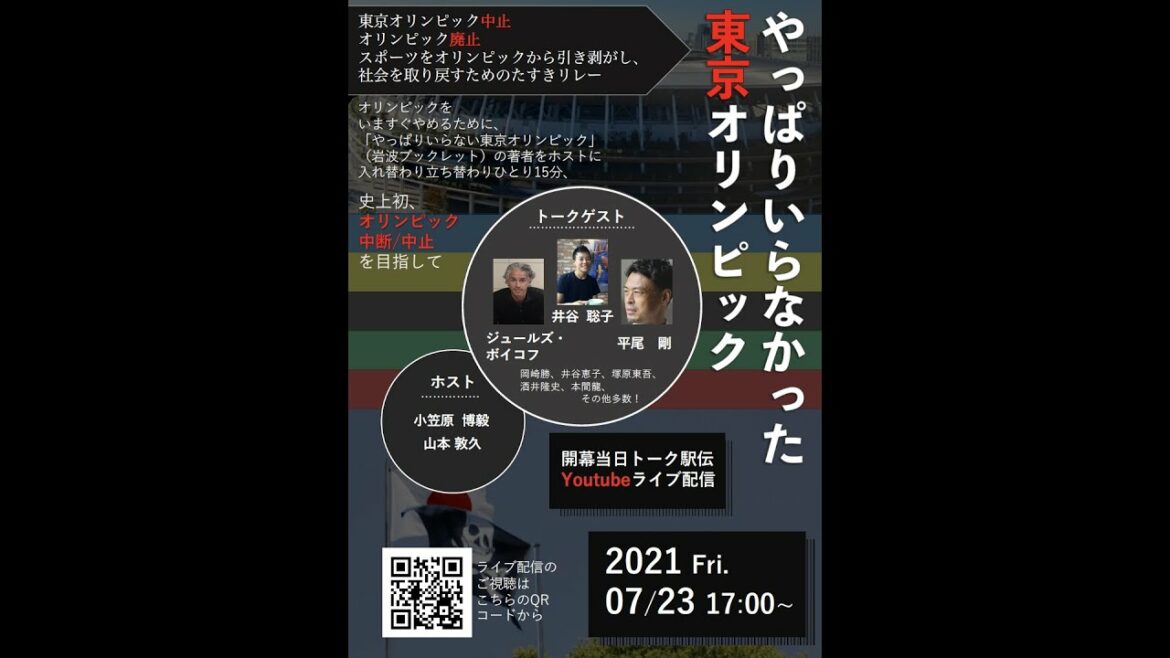 Cancellation, suspension, abolition of the Olympics … A three-hour talk relay of rage by the dissenters who have advocated the anti-Olympic Games “The Tokyo Olympics that I didn’t need after all”. Turn the sash to pull sports away from the Olympics and regain society. The moderators are Hiroki Ogasawara and Atsuhisa Yamamoto, the authors of “I don’t need the Tokyo Olympics” (2019, Iwanami Booklet). Thirteen commentators will take turns and talk for about 15 minutes each. * This video is a record of the live stream that took place on the day of the Tokyo Olympics on July 23, 2021.[Talk Ekiden runner list]0:00 Previous story (Introduction of event & moderator) 2:35 Cast introduction 4:15 1st runner Jules Boykov 13:30 2nd runner Satoko Itani 22:40 3rd runner Kiyoshi Abe 34:55 4th runner Taro Tamaki 51:15 5th runner Masaru Okazaki 1:08:20 6th runner Togo Tsukahara 1:24:20 7th runner Toko Tanaka 1:38:55 8th runner Ryu Homma 1:56: 40 9th runner Go Haraguchi 2:14:45 10th runner Takashi Sakai 2:34:10 11th runner Go Hirao 2:52:30 12th runner Keiko Itani 3:17:00 13th runner Satoshi Ukai 3:41: 05 Summary[Moderator]Hiroki Ogasawara Professor, Graduate School of International Cultural Studies, Kobe University. Specializes in cultural studies. His books include “Tell the Truth and Thinking of Stuart Hall in Its Total Complexity” (Shinsensha, 2019), “Football Culture and Race in Celtic Fundam-Grasgow” (Serika Shobo, 2017), ” “Anti-Tokyo Olympics Declaration” (co-edited by Koshisha, 2016), “I don’t need the Tokyo Olympics” (Iwanami Booklet, 2019) and many others. Atsuhisa Yamamoto is a faculty member of the Faculty of Social Innovation, Seijo University. Specializes in sports sociology, cultural studies, and body culture theory. His books include “The Age of Post-Sports” (Iwanami Shoten, 2020), “Anti-Tokyo Olympic Declaration” (co-edited with Hiroki Ogasawara, Koshisha, 2016), and “Unnecessary Tokyo Olympics” (co-authored with Hiroki Ogasawara). Iwanami Booklet, 2019), “Cultural Studies Learned from Events” (co-edited with Toko Tanaka and Takemasa Ando, ​​2017, published by Nakanishiya).[About the Post Study Group]The “Post Study Group” (commonly known as Posken) is a group of volunteers established on May 15, 2020 by several cultural studies researchers. Starting with the first book review of “The Age of Post-Sports” (Atsuhisa Yamamoto, Iwanami Shoten, 2019), post-sports, post-corona, post-feminism, etc. Discussing the issue. The study group invites related parties in various formats such as book reviews, talk events, research presentations, book planning, and consultations on papers, and conducts planning online (mainly zoom). There is no “official” HP or SNS account for the Post Study Group. Although there are several volunteer members for management, there is no one leader or representative, and the members are substitutes, outlines, and non-existent activities. While connecting with people of various genres such as editors, writers, artists, activists, athletes, and animators as well as researchers, we are exploring new possibilities for criticism and practice in the post-corona era. Post Study Group note https://note.com/posken.