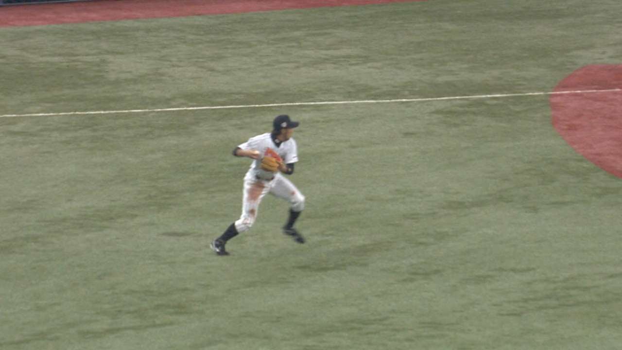 11/12/14: Ryosuke Kikuchi makes an acrobatic play on a ground ball off the bat of Ben Zobrist to get the out for Samurai Japan in the 3rd