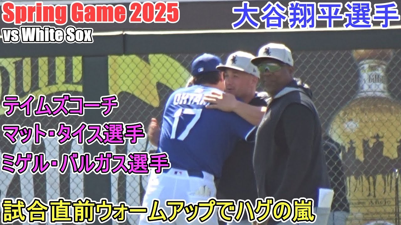 A storm of hugs during the warm-up just before the game – Coach Tames, Tice and Vargas -[Otani Shohei]Shohei Ohtani Spring Game vs White Sox 2025