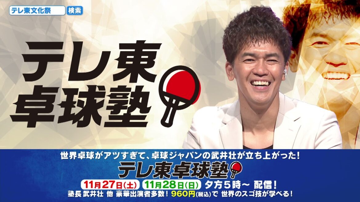 [Tele East Cultural Festival 2021 | Tele East Table Tennis School]Click here to purchase tickets ➡ https://w.pia.jp/t/tvtokyo-fes/ Click here for details ➡ Tele East Cultural Festival 2021 Official Website: https: // www .mworld.jp/tx-culture-festival2021/ Ticket sales site: https://w.pia.jp/t/tvtokyo-fes/ “World Table Tennis 2021” will finally open on the 23rd of this month. So Takei, the main caster of “Table Tennis Japan!” (BS TV Tokyo), who you know, will stand up on the weekend when the table tennis movement of the Olympic year reaches its climax! The name is “Tele East Table Tennis School”! Become the “principal” yourself and invite a special coach! The face is … Tokyo Olympic gold medalist Jun Mizutani! Kenta Matsudaira, the strongest handsome guy in the history of table tennis, and his eternal rival Jin Ueda, who won the world as a teenager! A serious table tennis school for table tennis players and their parents will be held online! There is a never-ending chance to learn apt table tennis from a legend !! “Tele East Culture Festival 2021” TV Tokyo will be an online distribution event this fall Held “Tele East Cultural Festival 2021”. Set in the live house Mixalive TOKYO in Ikebukuro, we carry out a lot of online distribution content with the theme of various cultures such as sports, games, and laughter. In addition, a special project is planned in collaboration with the virtual space Ikebukuro Mirror World.[* What is Ikebukuro Mirror World …]A community space on a virtual space released by TV TOKYO in March 2021. We provide a new experience where you can experience the immersive feeling as if you were out of the house through virtual theaters and virtual shops. You can enjoy it without downloading from your smartphone or computer, so please take this opportunity to try it.[Event name]”World Table Tennis 2021″ was too hot, and So Takei of Table Tennis Japan stood up! The name is “Tele East Table Tennis School”! !! -Learn from the amazing techniques of the world! Demonstration commentary by active players-[Delivery date and time]1st day: 11/27 (Sat) 17: 00-18: 30 2nd day: 11/28 (Sun) 17: 00-18: 30[Cast]■ Principal Takei Sou ■ Saturday, November 27, Kenta Matsudaira (former representative of Japan) Hitoshi Ueda (former representative of Japan) Misaki Morizono (former representative of Japan) Misaki Ikeya (TV Tokyo announcer) ■ Sunday, November 28, Hayashi Mizutani (Sun) Tokyo Olympics gold medal) Misaki Morizono (former representative from Japan) Kasumi Morizono (TV Tokyo announcer)[Ticket price]1200 yen including tax → 960 yen including tax for Goto event application[Limited to the first 300 people! Delivery ticket with TV Tokyo Table Tennis School special ball (set of 3)]1200 yen including tax → 960 yen including tax for Goto event (additional shipping fee 480 yen)[Ticket URL]https://w.pia.jp/t/tvtokyo-fes /[Sales period]11/10 (Wednesday) 12:00 to 12/5 (Sunday) 18:00[Archive period]to 12/5 (Sunday) 23:59[World Table Tennis 2021 Houston 11.23 (Tuesday) TV Tokyo series・ Broadcast daily on BS Tele East]The enthusiasm of the opening table tennis is once again! World table tennis will be broadcast! “World Table Tennis” has been broadcast on TV TOKYO since 2005. The 2020 Games were not held due to the influence of Corona, but this year the “World Table Tennis 2021” will be held for the first time in two years. The breakthrough of table tennis NIPPON at the Tokyo Olympics is new to my memory, but this time I will aim for the long-sought “defeat China” with the new table tennis NIPPON including medalists.[Participants]Men’s Singles: Tomokazu Harimoto, Takaki Niwa, Yukiya Uda, Masataka Morizono, Shunsuke Togami Women’s Singles: Mima Ito, Kazumi Ishikawa, Miu Hirano, Hina Hayata, Saki Shibata Men’s Doubles: Harimoto Tomokazu / Masataka Morizono, Yukiya Uda / Shunsuke Togami Women’s Doubles: Mima Ito / Hina Hayata, Yoshizumi Ishikawa / Miu Hirano Mixed Doubles: Tomokazu Harimoto / Hina Hayata, Yukiya Uda / Saki Shibata This is the first time in history Held in the United States. Exclusive terrestrial broadcast of enthusiasm from Houston, Texas. #Tele East Cultural Festival #Tele East Table Tennis School #World Table Tennis #Ikebukuro Mirror World #MixaliveTOKYO #Mixalive #Table Tennis #TV Tokyo #Ikebukuro #So Takei.