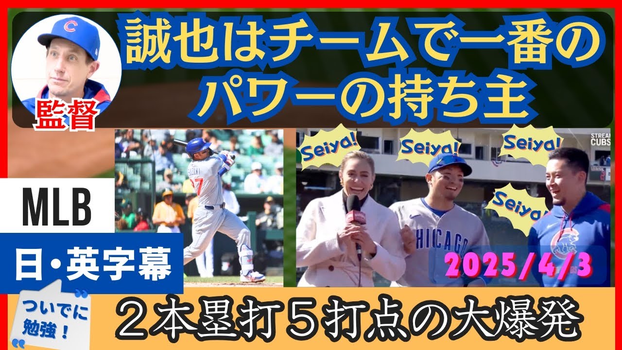 Cubs’ Suzuki Seiya performed well with two home runs and five RBIs. We will show you how the team’s pitchers and managers are extremely trusted in Japanese subtitles. The corresponding English is also included, so it is also great for studying English. (If you’re in fast English, we recommend playing it at 0.75 times the amount!) The motto is not too much of a stretch, not too exaggerated, and just based on actual comments. Basically, since it is translated one-on-one with English, there are some unnatural parts in some places, but I try not to cover it up with a random translation and try to maintain the original nuance. #Suzuki Seiya #Overseas Reactions #MLB #English Learning #Major League