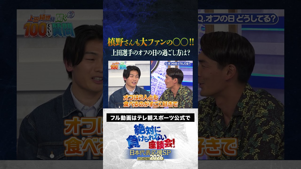 Provided by au YOUTUBE’s super popular program, “An absolute no-loss discussion!” with au YOUTUBE, with a total of over 2 million views. “Japan National Team Support SP ~ROAD to 2026 ~SEASON2” is now available! In addition to the familiar members such as Matsugi Yasutaro, Uchida Atsuto, Makino Tomoaki, and Kageyama Yuka, Ueda Kyoyo will also appear as the first guest! 00:00The first guest is Ueda Kyosei! 02:03 Kageyama interviews Ueda in the past 03:24 Ueda Kyoyo’s self-suggestion scene chosen by Ueda Kyoyo 06:43 Just enter about 100 questions and get a chance to win Ponta points in a lottery! 👉 https://camp.auone.jp/campaign/d3fdd01745e2bcbf66210fe3 ☀️☀️☀️☀️☀️☀️☀️☀️☀️☀️☀️☀️Performers: Matsuki Yasutaro Uchida Atsuto Makino Tomoaki Kageyama Yuka Ueda Kyoyo~~~~~~ Official TV Asahi Instagram https://www.instagram.com/tvasahi_soccer/[TV Asahi Soccer]Official X https://x.com/tvasahi_soccer[TV Asahi Soccer]Official TikTok https://www.tiktok.com/@tvasahi_soccer[TV Asahi Soccer]Official Website https://www.tv-asahi.co.jp/soccer/[TV Asahi Sports]Official X https://x.com/tvasahi_sports #Uchida Atsuto #Kageyama Yuka #Japan national soccer team #Soccer #Makino Tomoaki #Matsugi Yasutaro #Roundtable Discussion for Absolutely Can’t Lose #Ueda Kiyo
