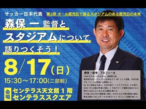 Japan’s national soccer team member Moriyasu Kazu Let’s talk about the stadium with the coach! Part 2: The Future of Kagoshima, with a Stadium in All Kagoshima, 17 August 2025 (SUN) @ Centeras Tenmonkan 1F Centeras Square ◆ Speakers ◆ Japanese men’s soccer team coach Moriyasu Kazushige Chairman, Kagoshima Prefecture Football Association Yukiji Tokushige Tsuyoshi, Director of Kagoshima United FC (Kagoshima Professional Sports Project), Director of Kagoshima United FC and Head of the Sports and Convention Center Development Division Nishi Hiroo, Mayor of Kagoshima City Shimotsuru Takao, Organizer: Kagoshima Prefecture Football Association Sponsored by: Kagoshima Prefecture, Kagoshima City Cooperation: Centeras Tenmonkan *The film was taken with permission in cooperation with the organizers.