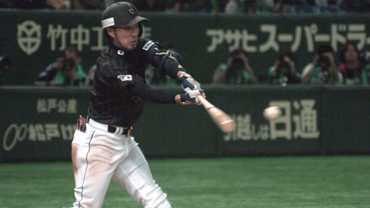 11/14/14: Ryosuke Kikuchi floats an RBI single to left field to score Hikaru Itoh and give Samurai Japan a 5-3 lead over the MLB All-Stars