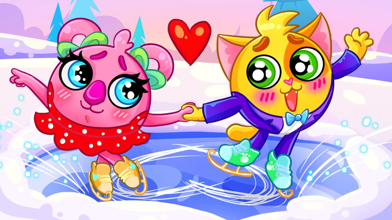 Our little friends Koala, Cat, Elephant, and Monkey are playing and having fun at the Winter Olympics.