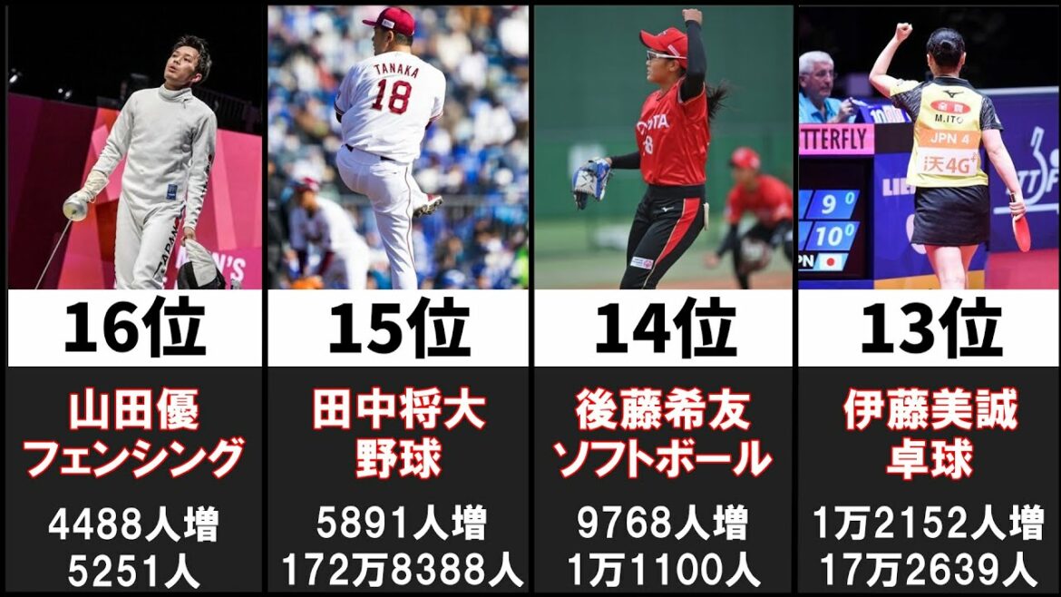 東京オリンピック(2021年)で金メダルをとった日本のメダリストのTwitterフォロワー数を、開幕前日の7月22日と閉会日の8月8日13時ごろに調べて、増加数のランキングを作りました