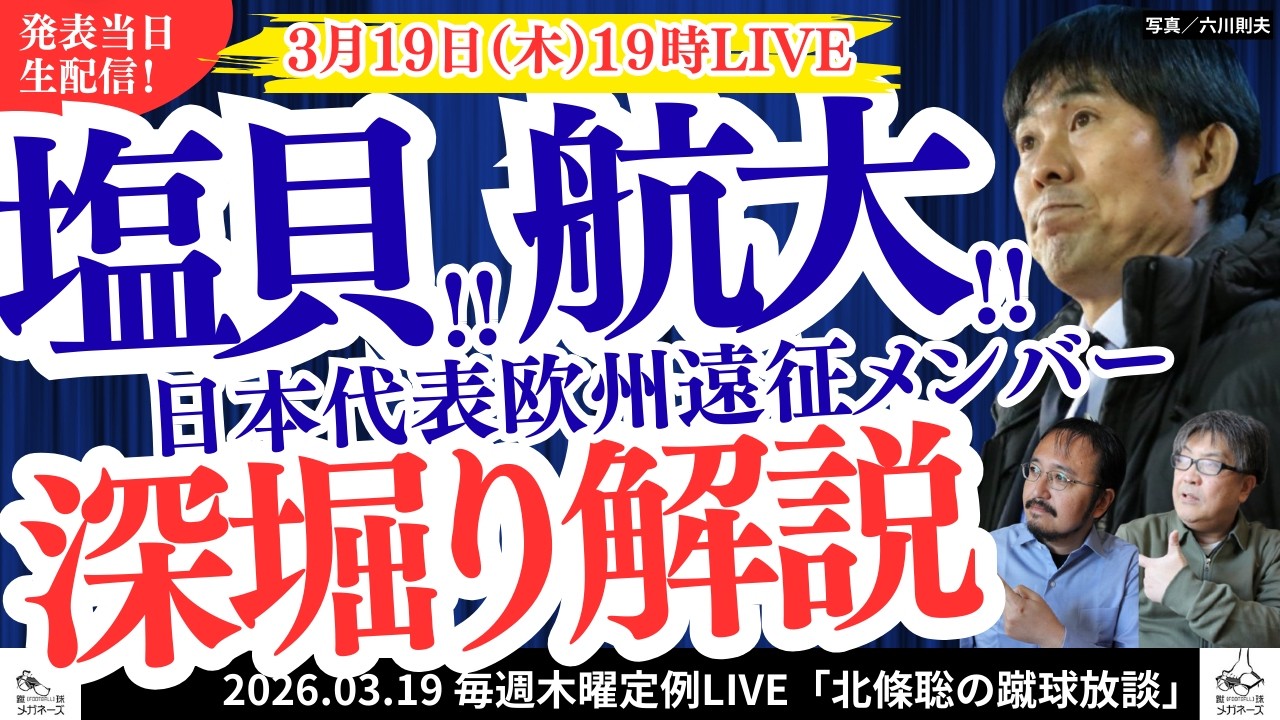 [AnnouncementonMarch19th(Thursday)⚽JapanNationalTeam]GK Tomoki Hayakawa (Kashima Antlers) Keisuke Osako Keisuke Osako (Sanfrecce Hiroshima) Ayane Suzuki Susuki Zion (Parma Calcio/Italy) DF Shogo Taniguchi (Sint-Truiden VV/Belgium) Tsuyoshi Watanabe (Feyenoord/Netherlands) Takehiro Tomiyasu Tomiyasu Takehiro (Ajax/Netherlands) Tomoya Ando Tomoya Ando (FC St. Pauli/Germany) Hiroki Ito Ito Hiroki (Bayern Munich/Germany) Ayumu Seko Aum Seko (Le Havre AC/France) Yuse Sugawara Yukinari Sugawara (Werder Bremen/Germany) Junnosuke Suzuki Junya Suzuki (FC Copenhagen/Denmark) MF/FW Junya Ito Junya Ito (KRC Genk/Belgium) Daichi Kamata Daichi (Crystal Palace/England) Kaoru Mitoma (Brighton & Hove Albion/England) Koki Ogawa (NEC Nijmegen/Netherlands) Daizen Maeda Maeda Daisen (Celtic/Scotland) Ritsu Doan (Eintracht Frankfurt/Germany) Kiyo Ueda Ayase (Feyenoord/Netherlands) Ao Tanaka (Leeds United/England) Shuto Machino (Borussia Mönchengladbach/Germany) Keito Nakamura Kate Nakamura (Stade Reims/France) Kaishu Sano Kaishu Sano (Mainz 05/Germany) Yuito Suzuki Yuito Suzuki (SC Freiburg/Germany) Chima Fujita Joru Fujita Joertima (FC St. Pauli/Germany) Kodai Sano Kodai Sano (NEC Nijmegen/Netherlands) Kento Shiogai Kent (VfL Wolfsburg/Germany) Keisuke Goto Goto Keisuke (Sint-Truiden VV/Belgium) Ryunosuke Sato Ryunosuke Sato (FC Tokyo)[Regular LIVE “Satoshi Hojo’s Soccer Chat” every Thursday from 20:00]A LIVE broadcast in which Satoshi Hojo (former editor-in-chief of Soccer Magazine) highlights and explains the games, teams, and players that have caught his attention recently. In the broadcast on March 19, 2026 (Thursday), we will talk about the members of the European expedition announced from 14:00 on that day with Akihiko Kawabata! *Streaming on this day will start from 7pm instead of the usual 8pm. Cast: Satoshi Hojo (former editor-in-chief of Soccer Magazine), Akihiko Kawabata (former editor-in-chief of El Golasso), MC Tatsu (administrator)[Shin Kikyu Meganezu]Japanese soccer legend Takashi Mizunuma, three former editors-in-chief of soccer-specific media, and glasses-wearing men Satoshi Hojo, Tomoo Aoyama, and Akihiko Kawabata are all gathered together! This is a talk channel where you can talk about your favorite soccer as much as you like 👓[Subscribe & Like! thank you! ][Members]Takashi Mizunuma Former Japan Soccer National Team Satoshi Hojo Former Editor-in-Chief of Soccer Magazine Tomoo Aoyama Former Editor-in-Chief of J League Soccer King Akihiko Kawabata Former Editor-in-Chief of El Golasso ]You can send messages anonymously! Your comments and questions are always welcome! https://marshmallow-qa.com/tpw01m0avx… #Japan Soccer National Team #World Cup #Kickball Glasses