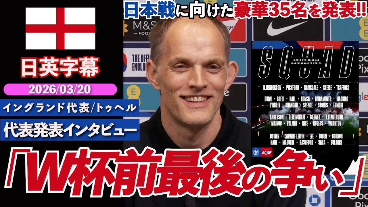 March 2026 Friendly Match England Representative Thomas Tuchel Representative Announcement Interview ===== We picked up an interview with England national team coach Tuchel who announced the 35-man squad for the match against Uruguay and Japan! As for the match against Japan, there is no doubt that the main players will appear, so I am looking forward to it🔥! ! ===== ⚫︎Chapter 00:00 Split the camp into two parts02:16 11 players who will join midway for the match against Japan03:52 What first-time players need to participate in the World Cup05:42 Players’ reactions when informed that they will join midway 07:08 Fierce competition for the No. 10 position ⚫︎ Source https://www.youtube.com/watch?v=7zRJddeB1ak ⚫︎ Recommended videos – Summary of English interviews with Japanese national team players for the 23/24 season ▼ Part 1 (Wataru Endo / Takehiro Tomiyasu / Kaoru Mitoma / Daiki Hashioka) https://youtu.be/b9cJFFL0sj4 ▼Part2 (Takefusa Kubo / Ritsu Doan / Takumi Minamino / Yusei Sugawara / Keito Nakamura / Yuta Nakayama) https://youtu.be/JElynyud4ow ▼Clop Last Interview https://youtu.be/tCaB9DsBFeM ⚫︎Recommended playlist ▼SAMURAI BLUE (Japanese players) https://www.youtube.com/playlist?list=PL0h29zdhvXBcG6tNeMGRsB2JAMKqPym3Y ▼Arenal https://www.youtube.com/playlist?list=PL0h29zdhvXBd1f6440pnzsI_FdR-Hd54j ▼Brighton https://www.youtube.com/playlist?list=PL0h29zdhvXBeKGCVSvFl8vvIM6h-KkWm4 ▼Liverpool https://www.youtube.com/playlist?list=PL0h29zdhvXBfZ-auU6NFcrPrmnqVwMt3V ▼Manchester United https://www.youtube.com/playlist?list=PL0h29zdhvXBc_nAog9nM1ipO4ANAO-jO8 ⚫︎Clip BGM Music | Reunion vow music BGMer https://bgmer.net ⚫︎ED BGM Music | “Love life” by LiQWYD Watch: https://youtu.be/vXuH-OoUJsM License: https://www.liqwydmusic.com/how-to-use Download/Stream: https://hypeddit.com/link/028ty7 ⚫︎Click here to subscribe to the channel https://www.youtube.com/channel/UCAcGTc3KAkrebDf45mOuddA Through this channel, we hope to deepen your understanding of European soccer and help you learn English. I do not own any rights to this clip. I just used it only for the purpose of educating and inspiring others in accordance with the fair use rules.