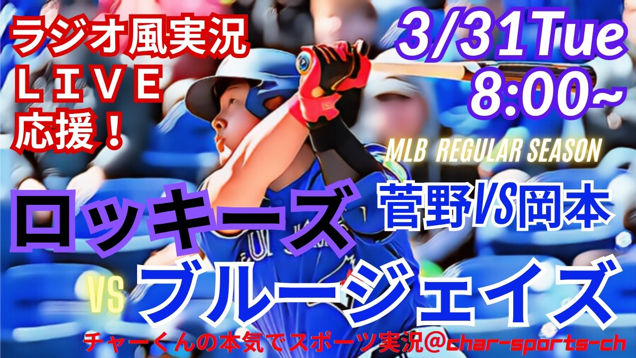 [Sugano VS Okamoto! Real radio style live commentary]Live live support for MLB Rockies VS Blue Jays in a radio style! Former Giants teammates and teacher-pupil duo face off for the first time on MLB’s big stage! I would like to support you with everyone! You can check the upcoming distribution schedule on Google Calendar. Please synchronize with your Google calendar → https://bit.ly/char-kun ◆Simultaneous distribution on Twitch! High image quality & high sound quality https://www.twitch.tv/charsportsch ◆ Simultaneously streaming on Digvoice! ◆Good sound quality! Almost no delays! Less data consumption/power consumption! Background play is possible! https://digvoice.onelink.me/Wq6d/x7fz38a2 ◆Music provided by: dugout. / Ren Suzuki, Big Valley’s Death Battle / Hikari Surprise Co., Ltd. #mlb Live #Kazuma Okamoto #Tomoyuki Sugano #Giants Showdown #Giants Showdown #Ace Gun #Shohei Otani Today’s News #LAD #Shohei Otani #Dual Sword Style #Mr. Otani #Yoshinobu Yamamoto #Aki Sasaki #Yoshinobu Yamamoto Today’s breaking news #Shohei Otani starting #Yoshinobu Yamamoto starting #Aki Sasaki starting #Dodgers #Dodgers #live #Mr. Otani #relay #mlblive #Dodgers #live distribution #live broadcast #ohtani #오타니 #Major League #simultaneous viewing #Shohei Otani today’s breaking news #Char-kun #Sports commentary #Major League #Home run #MLB #live #MLB live #Mets #Mets #Chiga Kodai #Otani #Two-way play #Home run #Baseball #baseball #Ohtanishohei #Padres #Matsui Yuki #Darvish #Darvish #Cardinals #Nootbar #Shota Imanaga #Suzuki Seiya #Cubs #Rockies #Tomoyuki Kanno #Angels #Yusei Kikuchi #Red Sox #R Sox #Masanao Yoshida #Pitcher Ohtani #Starting pitcher Ohtani #White Sox #W Sox #Munetaka Murakami #Munetaka Murakami today’s news Munetaka Murakami home run #Seiya Suzuki home run #Seiya Suzuki HR #Baseball #mlb #National League #West Division #Astros #Tatsuya Imai #Blue Jays #Kazuma Okamoto