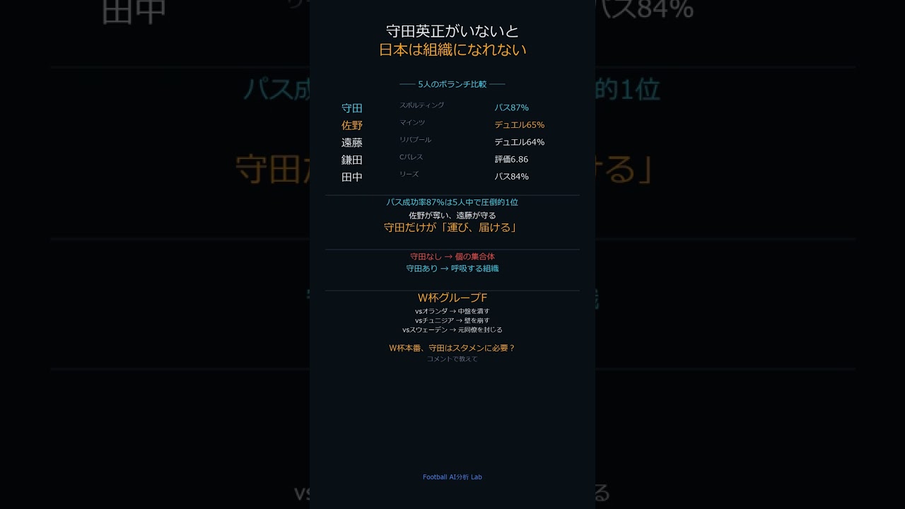 Data comparison of 5 volunteer candidates. Sano is the destroyer with 65% duel, and Endo is the shield. However, only Morita stands out with a passing rate of 87%. Without Morita = a collection of individuals, with Morita = a breathing organization. Is it necessary for the World Cup starting lineup? Let me know in the comments. #Japan National Team #Hidemasa Morita #World Cup 2026 #Shorts #Soccer #TOTOmini #toto #J League #AI prediction #Football *This is not investment advice. Purchase TOTO mini at your own risk. #shorts