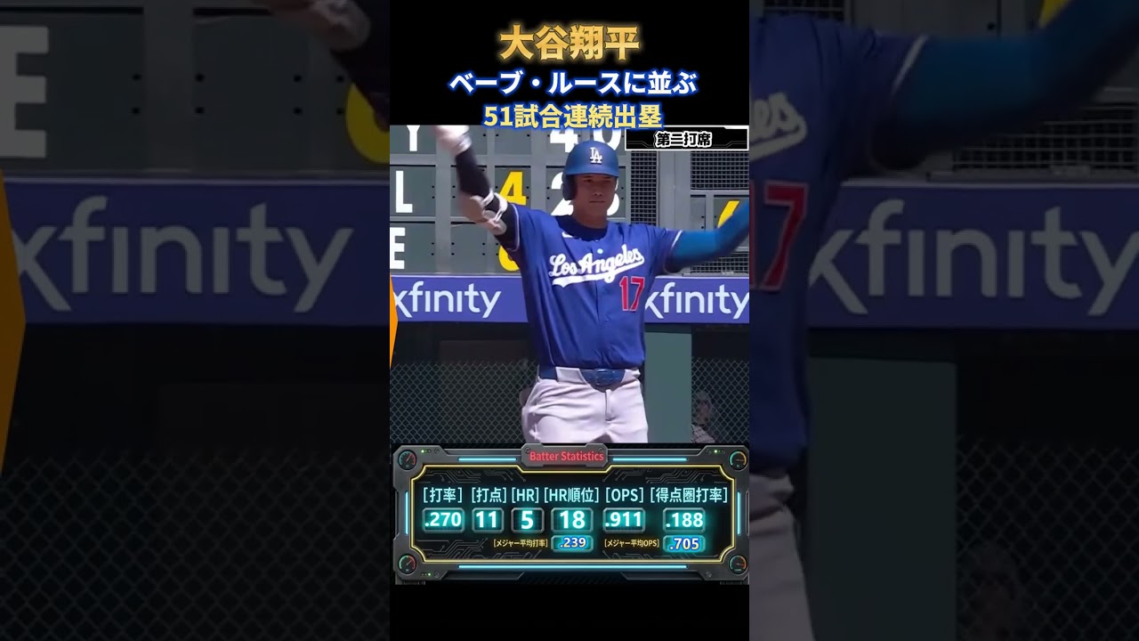 Dodgers pitcher Shohei Ohtani started the game against the Rockies held on enemy territory on the 19th (20th Japan time) as the “number one designated hitter.” He hit a double in his second at-bat, extending his streak of consecutive games on base since last year to 51, tying Babe Ruth’s record.