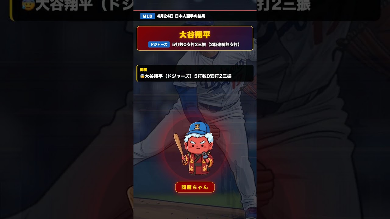 Summary of Japanese MLB players on April 24, 2026 (Japan time)! ✅ Seiya Suzuki (Cubs) 4 at-bats, 3 hits, 1 home run, 1 RBI, No. 3 solo in 3 consecutive games, contributing to the Cubs’ 9 consecutive wins! ✅ Shohei Otani (Dodgers) 5 at bats, 0 hits, 2 strikeouts, 2 consecutive games without a hit ✅ Murakami Munetaka (White Sox) 5 at bats, 1 hit, 3 strikeouts, 6 consecutive games, fine play on defense ✅ Yoshida Masanao (Red Sox) 4 at bats, 0 hits, 2 consecutive games without a hit #MLB #Shohei Otani #Suzuki Seiya #Munetaka Murakami #Masanao Yoshida #Dodgers #Cubs Audio: VOICEVOX (Goki, Zundamon, Shikoku Medan) Music: Yufuruka