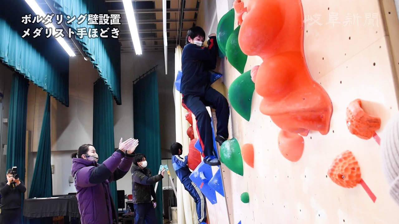 岐阜県下呂市金山町の金山小学校体育館に、ボルダリング用の壁が設置された。記念して、東京五輪スポーツクライミング女子で銅メダルを獲得した野口啓代さんが来場、登り方を指導しながら和やかに児童と交流した。
