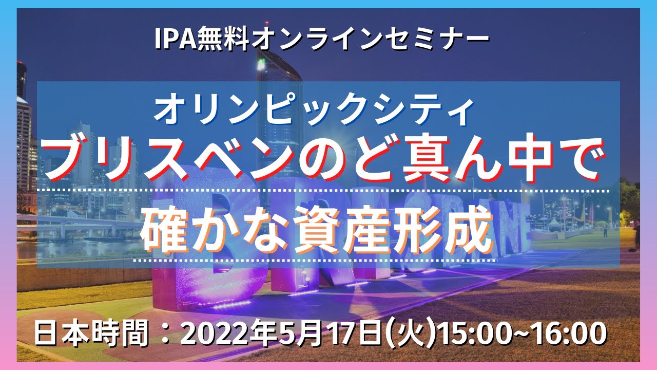 2022年5月17日に開催いたしました【オリンピックシティ・ブリスベンのど真ん中で確かな資産形成】IPAオンラインセミナーアーカイブ動画です。