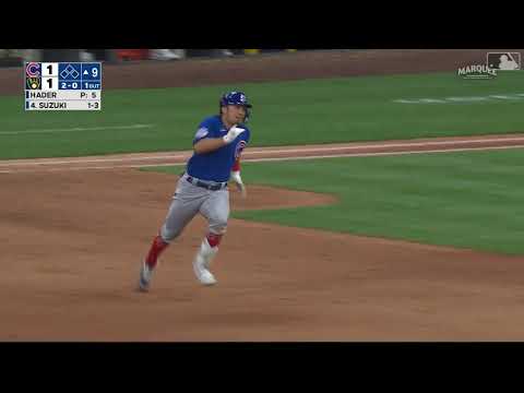 Seiya Suzuki clobbers an inside-the-park home run to center field off of Josh Hader, giving the Cubs a 2-1 lead in the top of the 9th inning.