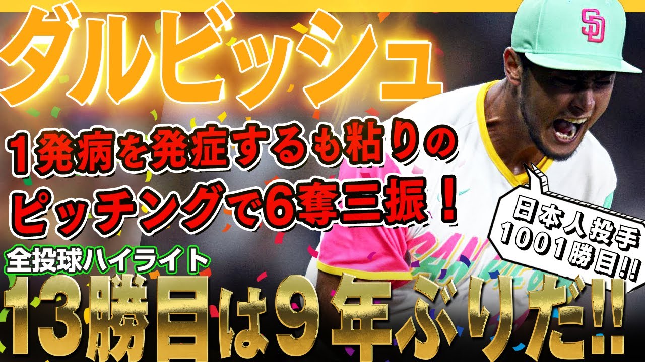Yu Darvish got his 13th win for the first time in 9 years. All 3 conceded goals were hit by home runs, but he struck out 6 with tenacious pitching! It’s amazing Yu Darvish! All pitches with highlights Darvish: ERA 3.31 Number of pitches 95 Strikeout 6 Runs 3 ▼ Champter 00:00 Opening 00:10 1st inning 01:31 2nd inning 03:51 3rd inning 06:27 4th inning 06 :10 Top of the 5th 10:15 Top of the 6th 12:00 Top of the 7th ▶MLB Game Results▽September 8, 2022 ⚾ MLB Diamondbacks vs. Padres 1 2 3 4 5 6 7 8 9 Total —— ————————————— Da 0 2 0 1 0 0 0 0 0 3 Pa 0 3 0 1 1 0 0 1 X 6 ▼Diamondbacks loss: Henry (7 games, 3 wins, 4 losses, 0 saves) Home run: Sho No. 22 (2 times, with Darvish), Carroll No. 1 (2 times, with Darvish) , Versho No. 23 (4 times, with Darvish) Stolen base: None ▼ Padres wins: Yu Darvish (26 games, 13 wins, 7 losses, 0 saves) Home run: Proffer No. 14 (2 times, Henry), Cronenworth No. 15 (2 times, Henry), Myers No. 4 (4, Henry) Stolen: Grisham (5) ▶ Padres Standings (September 8, 2022) NL West 1st Dodgers – 2nd Padres 19.0 3rd Giants 28.5 4th D-backs 29.0 5th place Rockies 36.0 📕 Yu Darvish A must-read book for fans!・ All data analysis Darvish strongest pitcher theory https://amzn.to/2S8YNuT ・ Yu Darvish’s breaking ball Bible Handy version https://amzn.to/3otEVyS ・ Yu Darvish’s breaking ball Bible encore https://amzn.to /3weniWq ▶ Data with Darvish 🏆 Title with Darvish NPB – Best ERA: 2 (2009, 2010) – Most strikeouts: 3 (2007, 2010, 2011) – Highest win rate: 1 (2009) *Awarded as the best pitcher MLB ・Most wins: 1 (2020) *2nd in Asian history, 1st in Japanese history and most strikeouts: 1 (2013) *2nd in Asian history, 2nd Japanese in history 🏆 Yu Darvish Awards NPB ・Eiji Sawamura Award: 1 time (2007) ・Best Player: 2 times (2007, 2009) ・Best Nine: 2 times (Pitcher Division: 2007, 2009) ) Many more MLB ・Monthly MVP: 1 time (Pitcher Division: July/August 2020) * 4th Japanese pitcher ・A League Monthly Rookie MVP: 1 time (April 2012) ・Topps Rookie All-Star Team ( English version) (Right pitcher category: 2012)[注 4]