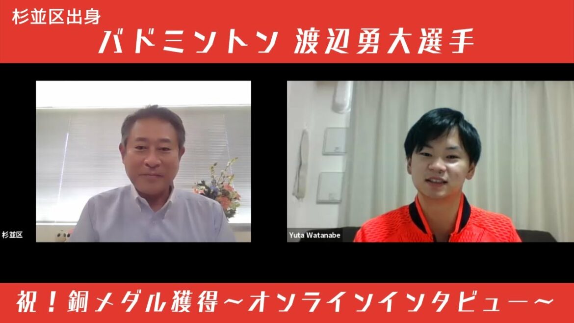 Yuta Watanabe from Suginami Ward, who participated in the Tokyo 2020 Olympic Games, won the bronze medal in the badminton mixed doubles paired with Arisa Higashino! This is the first time in Japanese history to win a medal in this event! In addition, he achieved the feat of winning the first medal in Japanese history as a male badminton player! In response to this feat, an online interview with Watanabe was realized! In the online interview, we received questions about the Olympic Games from Mayor Tanaka and Suginami Ward staff.