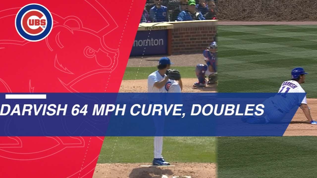 Yu Darvish unleashes a 64 mph breaking pitch to record a K, then hits an entertaining double down the line in the bottom half of the inning
