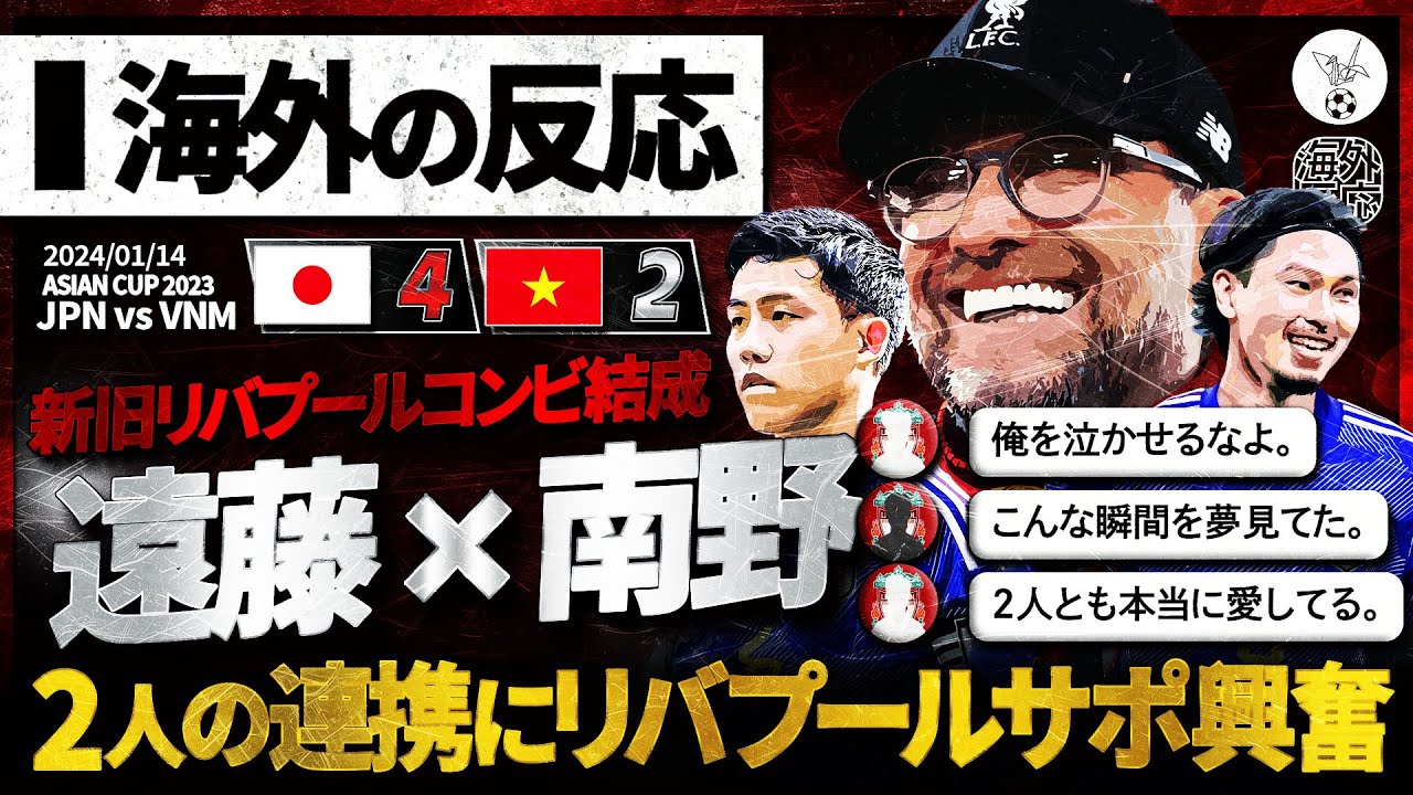 Previous video ▶ https://youtu.be/lcSXdaz6-qk 2024/01/14 Asian Cup Group D Round 1 Japan vs Vietnam result: Japan won 4-2. What stood out in this match was the great performance of Takumi Minamino, who recorded 2G and 1A and won an undisputed MOTM. In particular, Minamino’s second and valuable equalizing goal came from an assist from Wataru Endo, and this collaboration attracted the attention of Liverpool supporters. In this video, please take a look at the reactions of overseas Liverpool supporters who are excited about the collaboration between Minamino (formerly of Liverpool) and Endo (currently of Liverpool). ▼Timeline▼ 0:00 Opening 0:52 Start of the match 0:57 First half 11 minutes Takumi Minamino GOAL 1-0 1:30 First half 16 minutes Nguyen Dinh Bac GOAL 1-1 2:29 First half 33 minutes Pham Tuan Hai GOAL 1- 2 3:49 First half 45 minutes Takumi Minamino GOAL 2-2 5:18 First half 49 minutes Keito Nakamura GOAL 3-2 6:47 Halftime 8:57 Second half start 10:07 Second half 40 minutes Kiyo Ueda GOAL 4-2 12 :27 After the game▼Related videos▼ https://youtu.be/kwZGKeUExqo https://youtu.be/90jZjxdi5PY https://youtu.be/FR-4zA7rCPE https://youtu.be/tkRIkmcmKeo https:// youtu.be/RhexAGoupR8 https://youtu.be/EoN6rOu504k https://youtu.be/a7kpBj2zBKo https://youtu.be/v4VwCUbb7rA https://youtu.be/7EYgUmruakI https://youtu.be/Nbt_5dfVce4 https://youtu.be/I-KpnvHfOOY https://youtu.be/_NqSicDwr-0 https://youtu.be/5YvMnFPb9og https://youtu.be/O2YE6CoiIvg Please like, subscribe, and comment. Masu. ▼Japan national team uniform▼ https://a.r10.to/hkmTZ2 ▼U-NEXT 31-day free trial▼ https://px.a8.net/svt/ejp?a8mat=3TF5FP+5O7P9U+3250+6KU8J ▼DMM ×DAZN Hodai▼ https://px.a8.net/svt/ejp?a8mat=3TF67J+9X83QQ+59RE+5YZ77 #Overseas reaction #Japan national soccer team #daihyo #samuraiblue #w cup #World Cup #Asia Cup #AFC Asian Cup #Asian Cup #AsianCup2023 Twitter: https://twitter.com/samuraiblue2fin _________________________________________________________________________________ Sound effect: DOVA-SYNDROME https://dova-s.jp/ VOICEVOX: Ryusei Aoyama, Kotaro Shirakami, Masao Kenzaki, Kurono Takehiro, Shuji Susumatsu, Sourin Kirigashima, Al Nekoshi, Ritsu Nami, Mochiko (CV Asuha Yomogi), WhiteCUL Reference: https://twitter.com