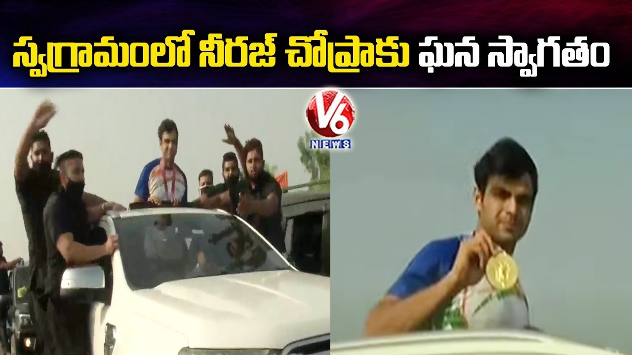 Tokyo Olympics Gold Medallist Neeraj Chopra Reaches Hometown Samalkha, Receives Warm Welcome. #NeerajChopra # TokyoOlympics2021 Gold Bangs | We do not believe https://youtu.be/8jpI5APaFpI Our home tour https://youtu.be/tbpb9nFyQLs Do not believe us https://youtu.be/cDhydRI_qpA No more golden dalits https://youtu.be/JvYF 8g బడికి వేళాయెరా https://youtu.be/ezWvowR-uR0 ► Subscribe to V6 News Telugu: YouTube at http://goo.gl/t2pFrq ► Like us on Facebook: http://www.facebook.com/V6News. tv ► Follow us on Instagram: https://www.instagram.com/v6newstelugu/ ► Follow us on Twitter: https://twitter.com/V6News ► Visit Website: http://www.v6velugu.com/ ► Join Us On Telegram: https://t.me/V6TeluguNews News content that serves the interests of Telangana and Andhra Pradesh viewers in the most receptive formats. V6 News channel Also Airs programs like Teenmaar News, Chandravva & Padma Satires etc, Theertham, Muchata (Celeb Interviews) Cinema Talkies, City Nazaria (Prog Describes The Most Happening & Visiting Places In Hyderabad), Mana Palle (Describes Villages And Specialties), Also V6 News Channel Is Famous For ‘Bonalu Songs’, ‘Bathukamma Songs’ And Other Seasonal And Folk Related Songs. “V6Teenmaar News”, “Teenmaar News”. # V6NewsLive #TelanganaNewsLive.