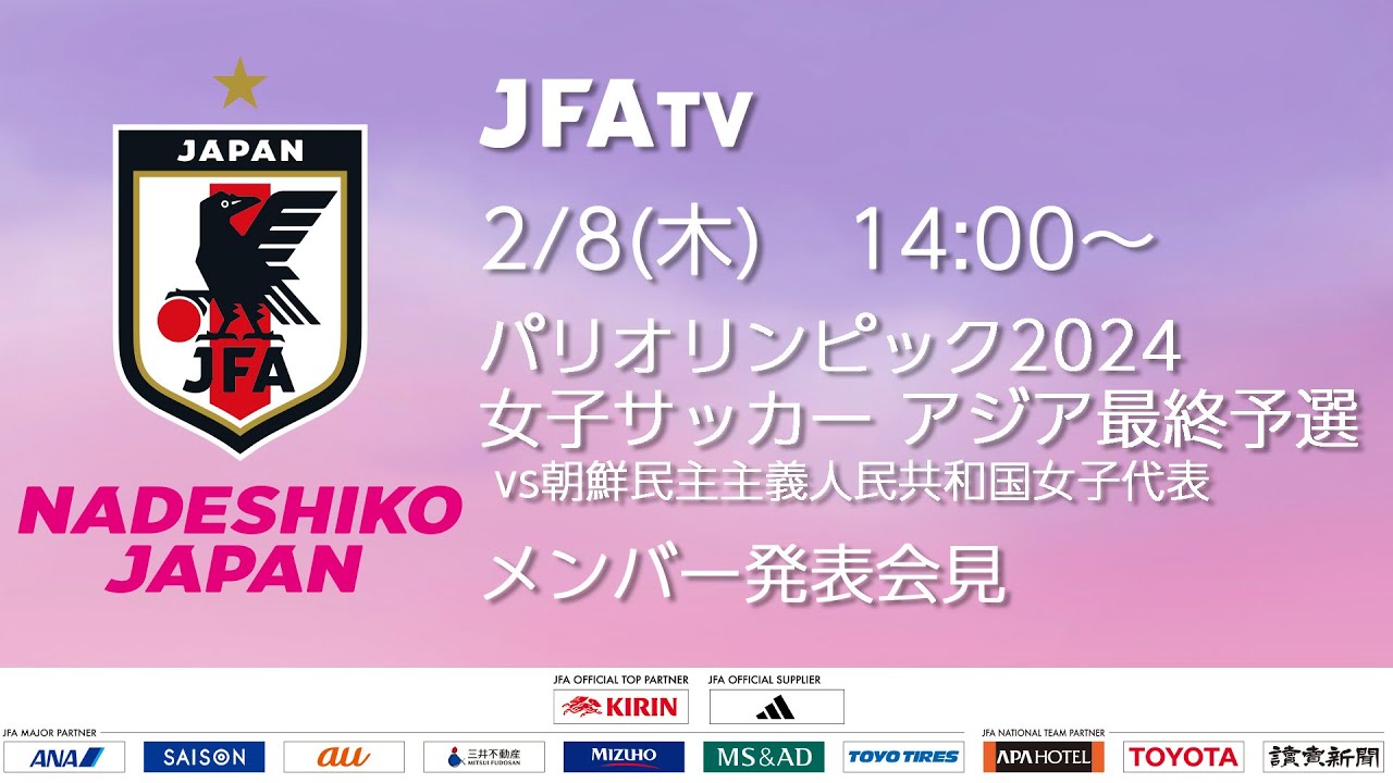 We will be live streaming the press conference announcing the members of the Paris Olympics 2024 Women’s Soccer Asian Final Qualifiers (Japan Women’s National Team). ●Press conference date and time: Thursday, February 8, 2024, 14:00 ▼Japan’s match schedule https://www.jfa.jp/nadeshikojapan/ ▼For ticket information for February 28 (@National Stadium), click here https: //www.jfa.jp/nadeshikojapan/20240228/ticket.html#pankz *You may not be able to view it due to line conditions or equipment problems. Please note. *Please note that the delivery URL may be changed at short notice in the event of a problem.